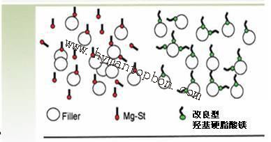 - 由于改良型羥基硬脂酸鎂具有的橋梁作用,使到改良型羥基硬脂酸鎂與樹脂,以及無機填充物,添加劑,色粉形成一個整體